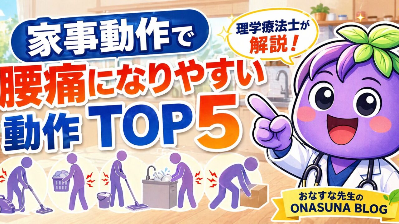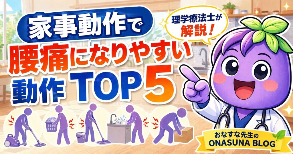 特に前かがみ・中腰・ひねりを伴う動作は腰椎への負荷が大きく、中腰の姿勢では体重の1.5倍もの負荷が腰にかかるとされています。今回は「腰に危険な家事動作TOP5」とその正しいやり方を、おなす君と一緒に確認していきましょう。