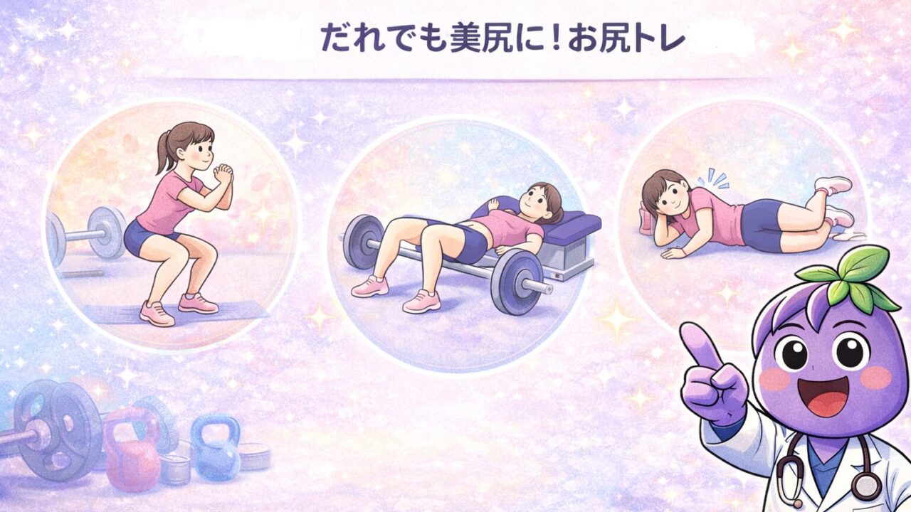 - 鍛えるのは「大臀筋・中臀筋・小臀筋」