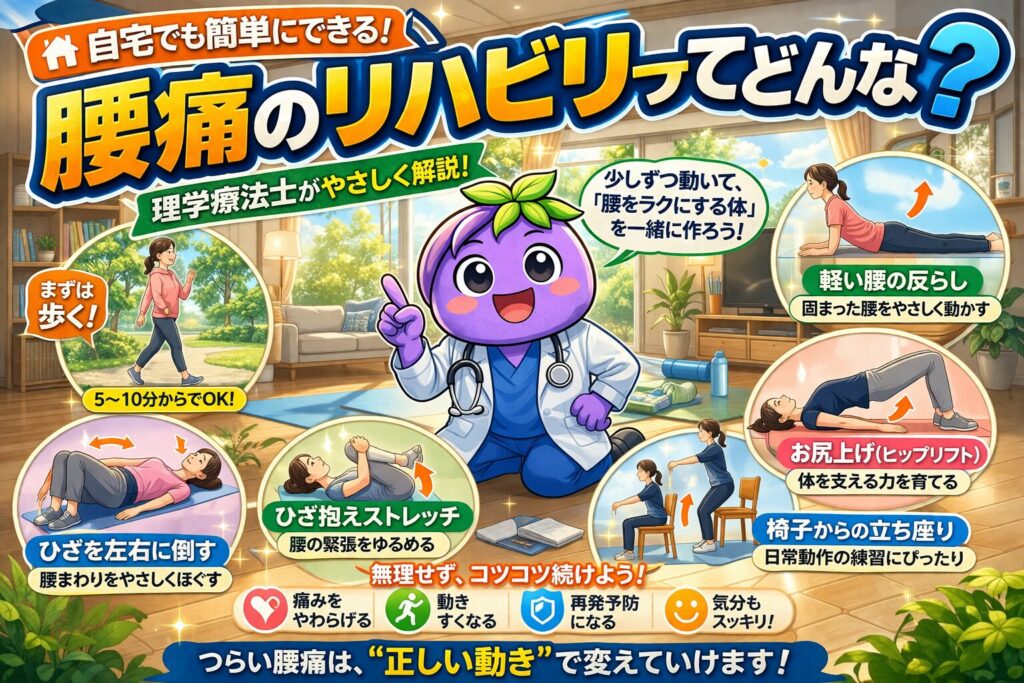 自宅での腰痛リハビリは、“特別な難しいこと”ではなく、少しずつ動くことが基本です。